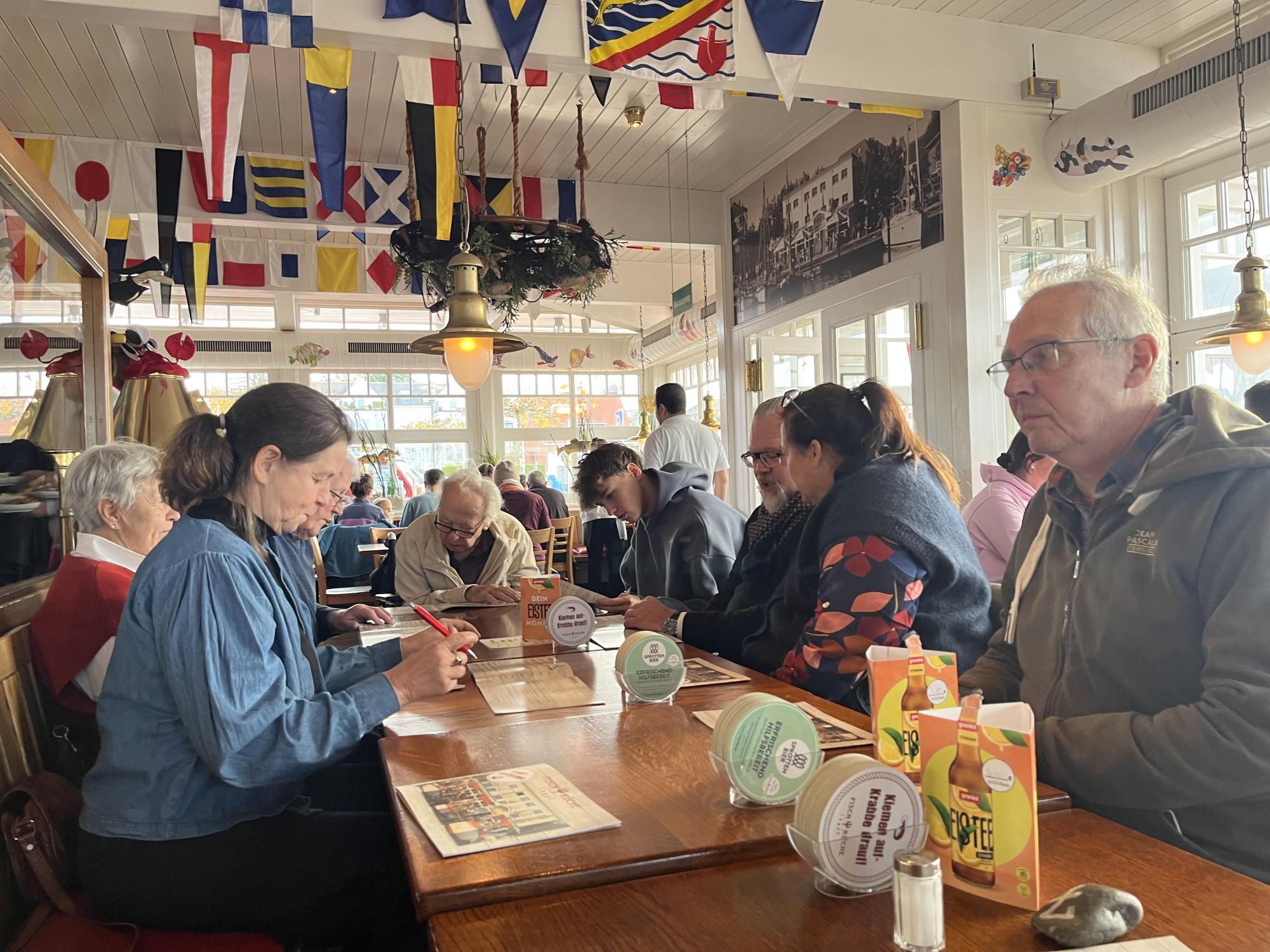 Die Fahrt ist sehr angenehm, blauer Himmel und regenfrei. Der Hafen von Laboe empfängt uns auch mit schönem Wetter und noch zwei weiteren Familienmitgliedern, die uns dankenswerterweise einen Tisch in dem sehr gut besuchten Fischrestaurant organisiert haben. Wir essen sehr lecker Fisch, und Herr T. genießt es, so im Kreise seiner Familie, mit Blick auf den Hafen, in dem noch recht viele Boote liegen.