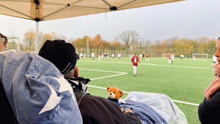Nach einer herzlichen Begrüßung und einem flotten Spruch seitens unseres Fahrgastes ging es zum nahegelegenen Sportplatz nach Kronshagen bei Kiel. Gut geschützt unterm Zelt und warm in unsere Decke eingepackt bekam Ehren-Fan Herr M. einen Logenplatz. Nicht sein Stammplatz, den er bei jedem Spiel von Enkel Lasse eingenommen hatte, aber exklusiv für ihn.