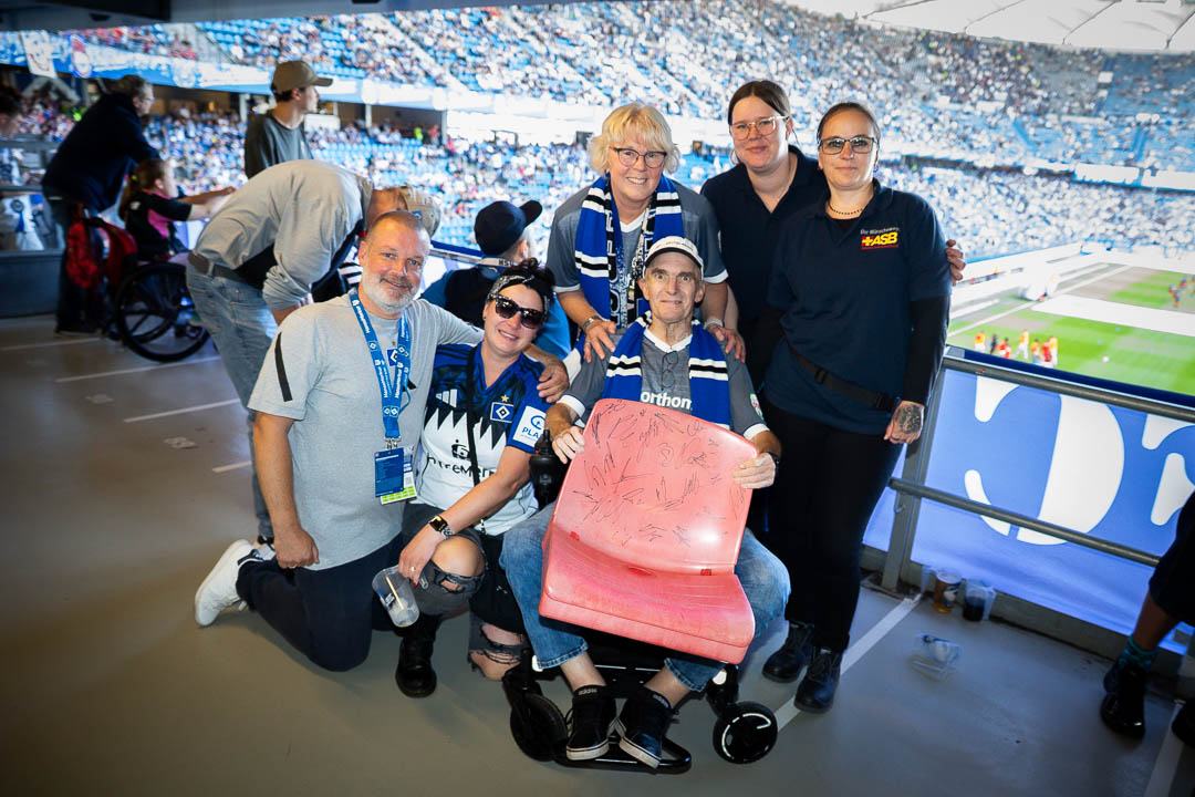 Nachdem wir R. vom Rollstuhl auf die Trage umgesetzt hatten, ging es auch schon los zum Volksparkstadion. Dort angekommen, wurden wir von einer Mitarbeiterin empfangen, die uns zu unseren Plätzen brachte und uns viel zur Geschichte des Stadions erzählte.