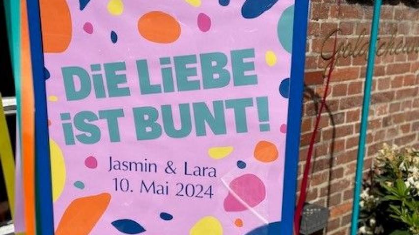 „Liebe ist bunt!“ ist das Motto der Hochzeit – und es hätte nicht schöner umgesetzt werden können. Strahlender Sonnenschein, Gäste in wunderschöner, bunter Kleidung und ein liebevolles Eheversprechen von Lara und Jasmin. Die Musiker, die in jeder Hinsicht den richtigen Ton getroffen haben, spielten begleitend zum Ja-Wort „Wenn nicht für immer, dann wenigstens ewig“, von Peter Maffey, ein ganz besonderer Moment, der noch besonderer wurde, als Karin laut und deutlich in die Zeremonie reingerufen hat: „Und ich bin ja auch noch für Euch da!“.