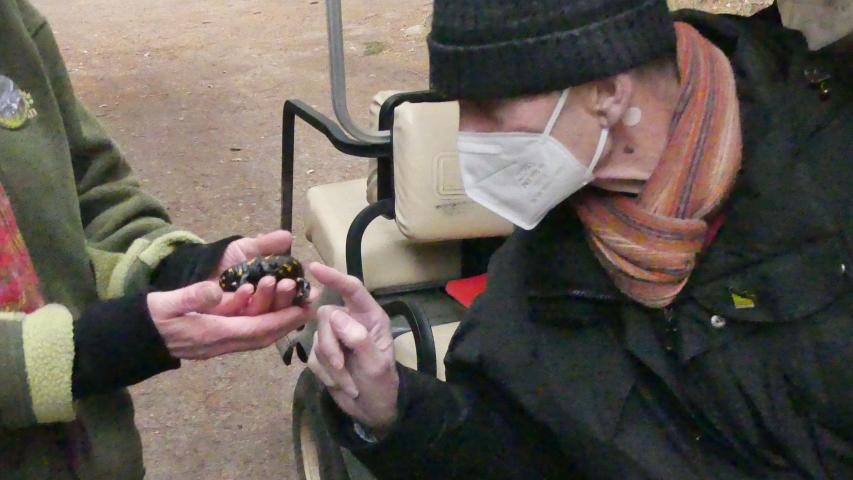 Nächster Halt: Wildschweingehege. Unser Fahrgast hat extra Walnüsse für die Tiere mitgebracht und passt genau auf, dass alle die gleiche Ration erhalten. Auf dem Rückweg machen wir noch einen kurzen Zwischenstopp bei den Feuersalamandern. Uta holt eines der kleinen Tiere aus dem Terrarium, damit wir es uns von Nahem anschauen können. Der trockene Kommentar von ihr, das schwarzgelbe Tierchen sehe aus wie „ein dickes, ungebratenes Würstchen“ ist zwar nicht sehr schmeichelhaft, trifft es aber doch irgendwie sehr passend.