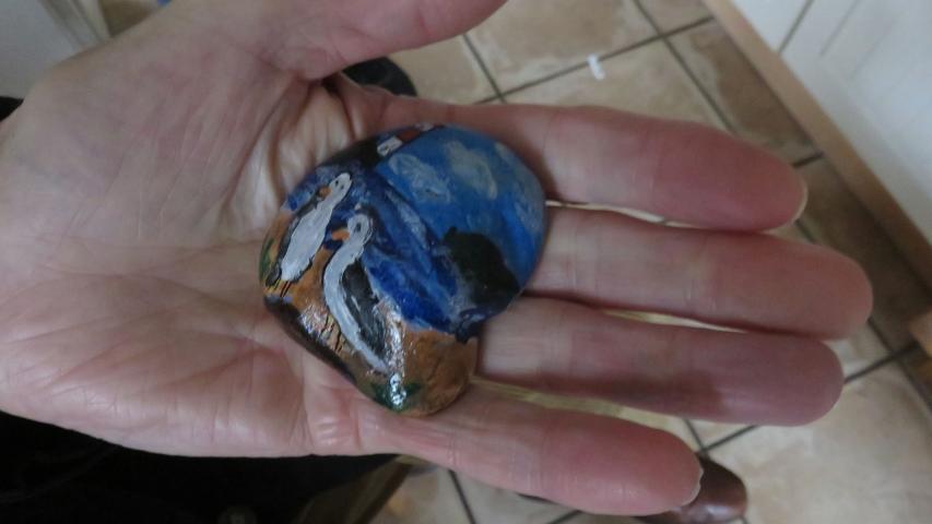 Und schon neigt sich unsere Rundfahrt dem Ende. Zum Abschied sucht Herr S. sich noch einen ElbStone aus unserem Glas aus. Das Motiv zeigt zwei Möwen an der See. Auch hier bleibt er seiner Tierliebe treu. Seine Hand umschließt fest den Stein – eine bleibende Erinnerung an einen schönen Tag.