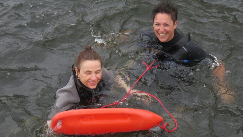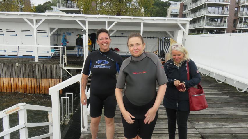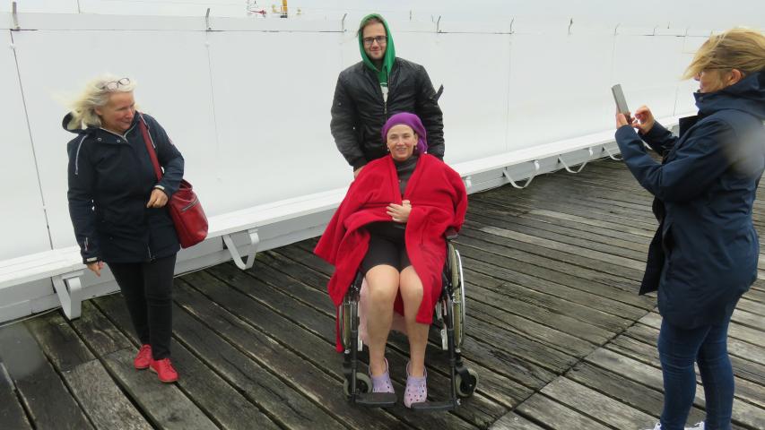 Wir machten uns fertig für die Fahrt, Ivonnes Sohn begleitete sie im Wünschewagen, ihre Freunde fuhren uns hinterher. An der Seebadeanstalt, die eigentlich bereits in der Winterpause ist, wartete Sven mit Neoprenanzügen auf uns. Wir entschieden, dass ich mit Ivonne ins Wasser gehe. Sven hatte auch einen Schwimmgürtel und eine Rettungsboje mitgebracht, beides kam zum Einsatz. Die Worte von Ivonne im Wasser: „Geil, geil, geil….“ Sie erzählte, dass sie ganz oft bei Wind und Wetter schwimmen gegangen ist.