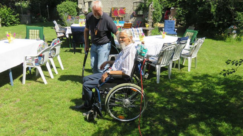 Groß war die Aufregung unseres Fahrgastes am Tag davor gewesen. Erst kurz vor Mitternacht habe er geschlafen, und um 5.30 Uhr sei er schon wieder wach gewesen, erzählte er. So sehr freute er sich auf seine Familie und all seine Freunde, die ihm bei schönstem Wetter ein herzliches Willkommen bereiteten. Es wurde viel miteinander gelacht und gesungen, und dank unserer tatkräftigen Helfer wurden auch die zehn Treppen hoch zum Atelier bewältigt. Hier, an seinem wichtigsten Rückzugsort, hatte Herr J. einige Zeit ganz für sich allein zum Abschiednehmen.