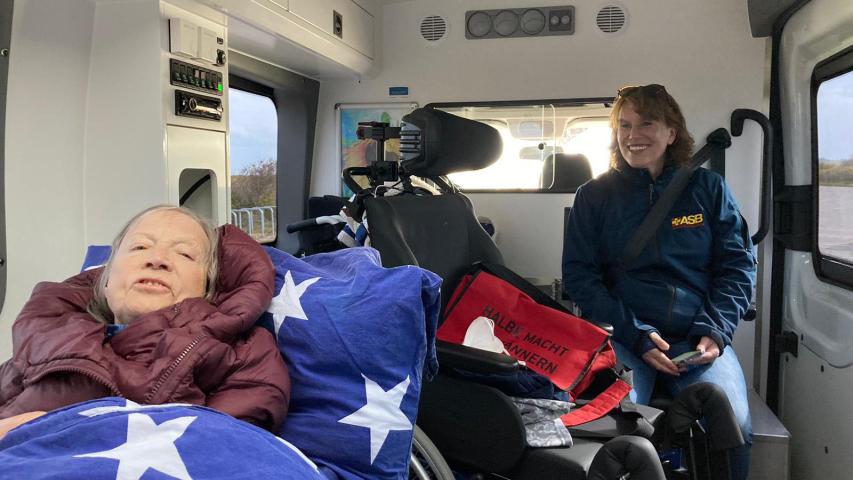 Die Mitarbeiterinnen im Hospiz sind liebevoll-professionell und wünschen uns eine gute Fahrt. Das Haus ist erst im letzten Jahr eröffnet worden, es sieht noch neu aus und Lucie erzählt lachend, dass ihr Mann, als Tischler, auch schon mal ganz praktisch Hilfe geleistet hat, als eine Tür klemmte. Diesen Pragmatismus brauchen wir auch jetzt, um den Rollstuhl, der eigentlich gar nicht in den Wagen passt, doch mitnehmen zu können. Patrick kommt aus dem Rettungsdienst und findet eine gute Lösung. Wir transportieren Clara liegend, Lucie und ich sitzen bei ihr, Laura vorne bei Patrick. Die Fahrt ist relativ kurz, wir nutzen die Zeit, um uns ein bisschen besser kennenzulernen, auch wenn ich bereits im Hospiz ein Gefühl von großer Sympathie hatte. Ich habe es noch nie erlebt, dass die Chemie zwischen Fahrgast und Begleitungen nicht stimmt, trotzdem ist es immer wieder ein aufregender Moment und eine große Herausforderung. Wir verbringen einen Tag mit viel körperlicher - und im Idealfall emotionaler Nähe miteinander.